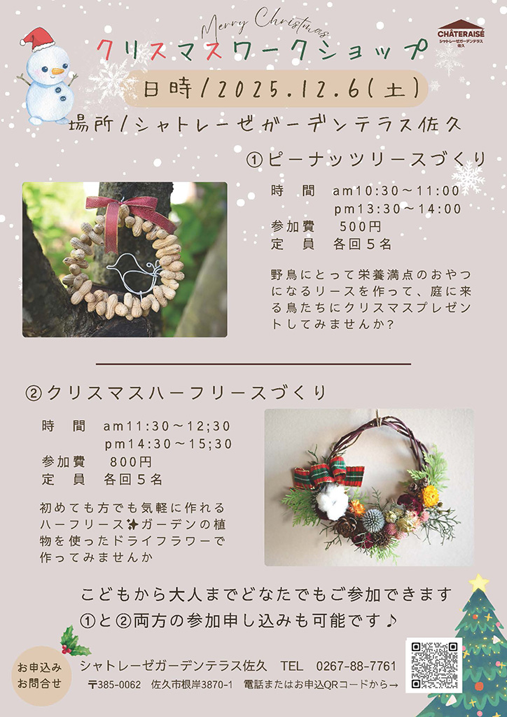①アピーナッツリースづくり AM10:30〜11:00、PM13:30〜14:00