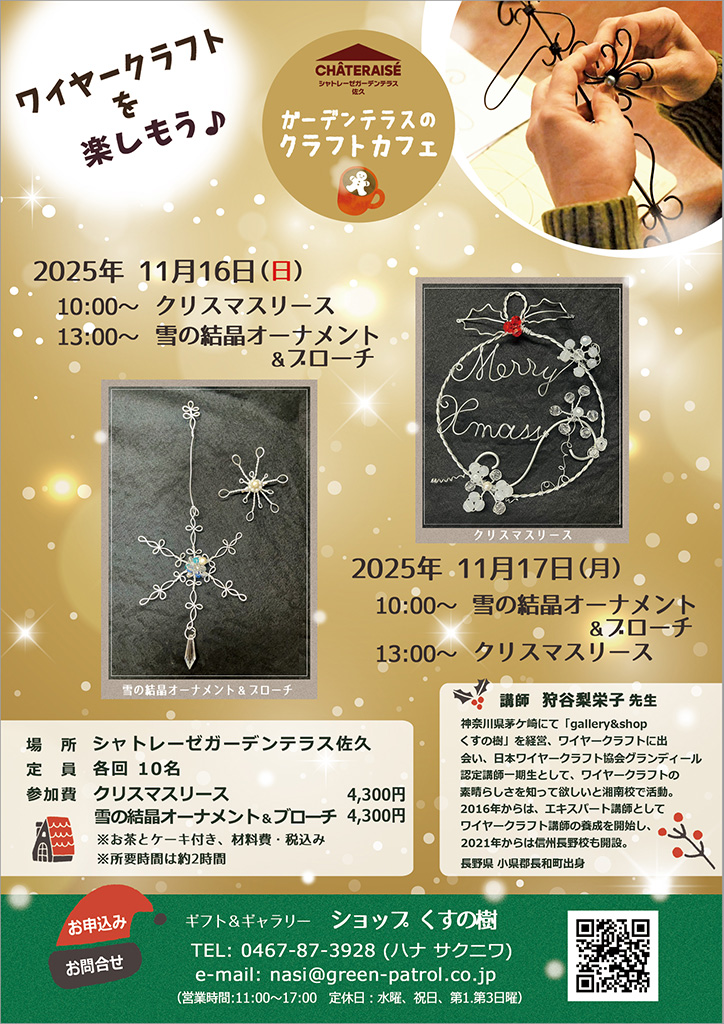 10:00〜雪の結晶オーナメント&ブローチ 13:00〜クリスマスリース(所要時間約2時間)